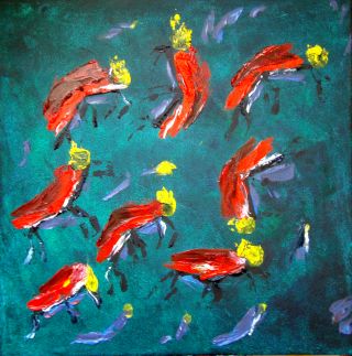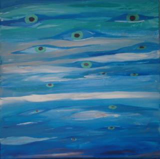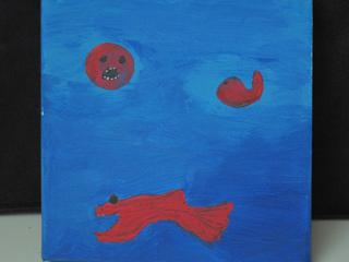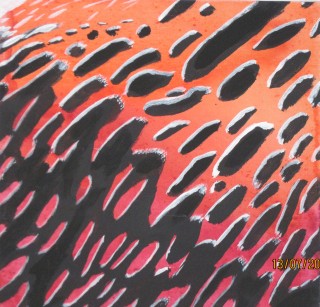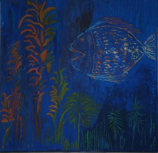 Lfd.Nr. 28 IMG_0153 2013 40x40 (Kratztechnik; Bild teilweise übermalt, die weißen Markierungen rechts oben werden durch einen Fisch in der rechten Bildhälfte ersetzt) |